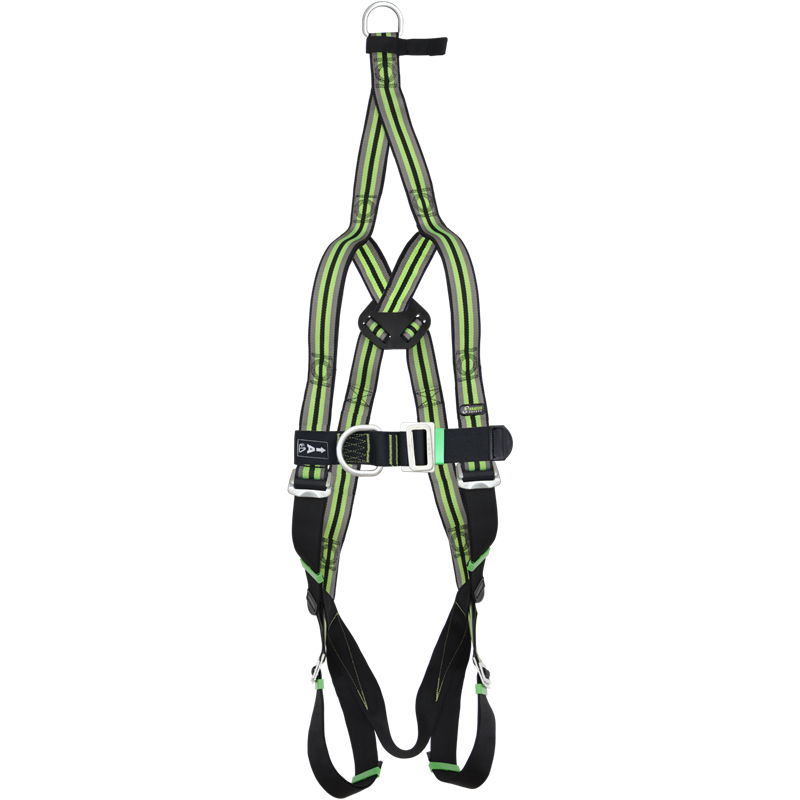 Dorsal and frontal fall arrest attachment point composed of two straps.