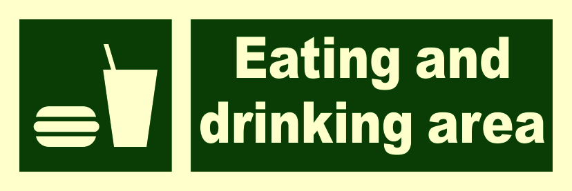 Safety Signage>Signage Photoluminescent Safety sign - Eating and drinking area Productcode: 144186 Download this page Photoluminescent Safety sign - Eating and drinking area Request Quote
