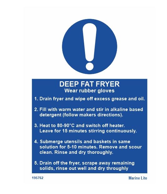 Safety Signage>Signage Galley sign - Deep fat Fryer - Wear rubber Gloves (200x250) Productcode: 145762 Download this page Galley sign - Deep fat Fryer - Wear rubber Gloves (200x250) Request Quote