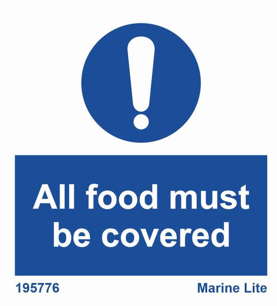 Safety Signage>Signage Galley sign - All food must be covered 10x10 cm Productcode: 145776 Download this page Galley sign - All food must be covered 10x10 cm Request Quote