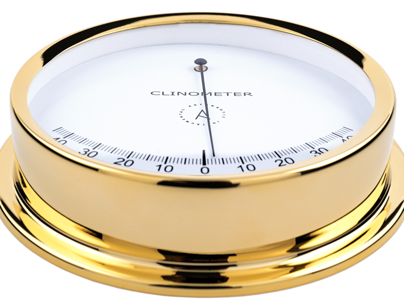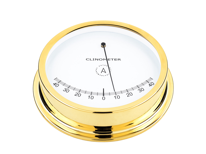 Nautical Equipment>Radio / Chartroom equipment Clinometer pendulum type 150mm Productcode: 198555 brass marine clinometer - Pendulum type, oil demped - 150mm dia backflange - 125mm dia white dial - Range 40-0-40 degr. Documents Product Datasheet Download this page Clinometer pendulum type 150mm Related products Barometer 150mm Barometer 150mm incl. calibration certificate Chronometer/quartz/mahogany Quartz clock 150mm Quartz clock 4" Thermo/Hygrometer 4" Request Quote