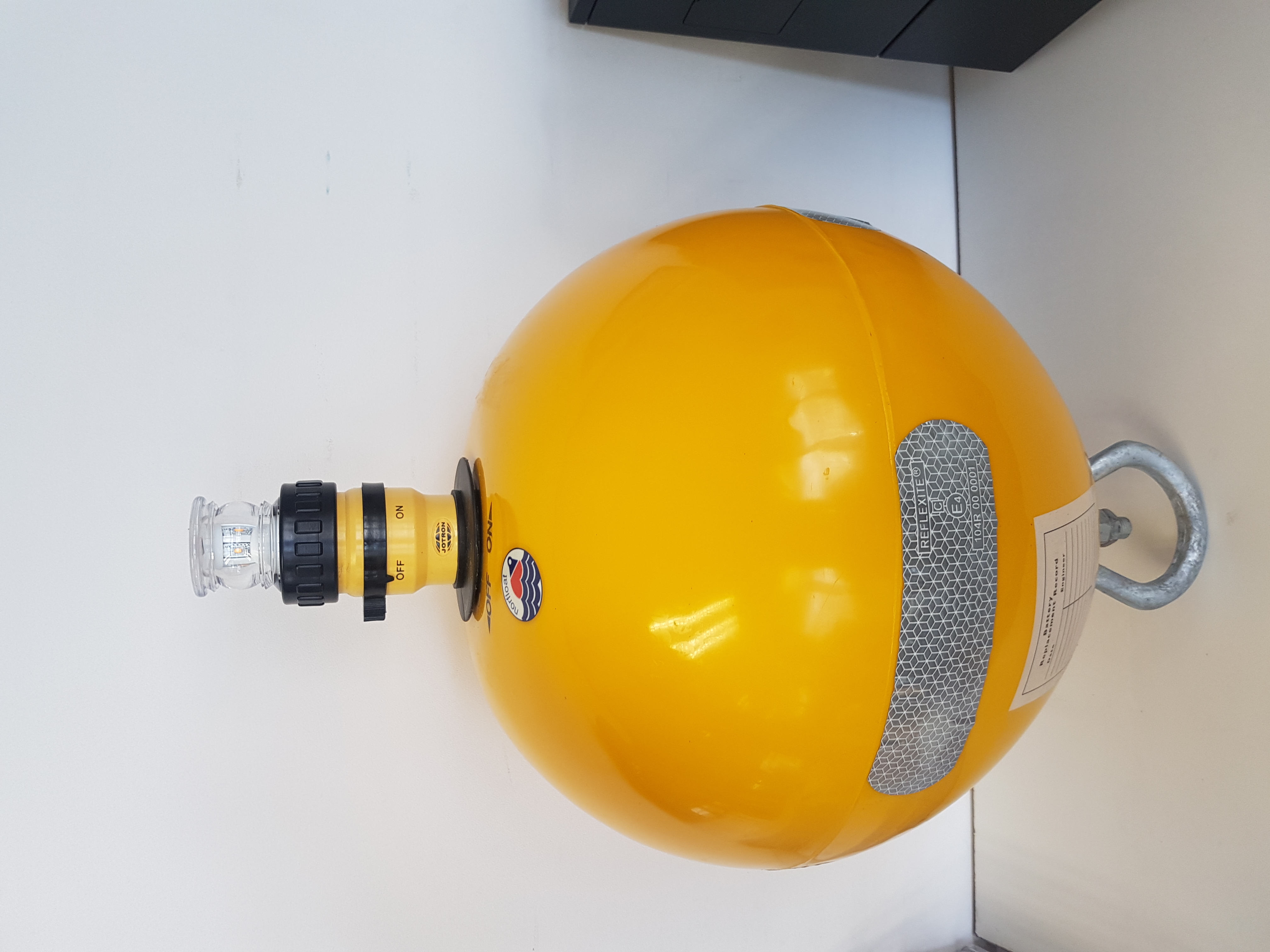 The buoy has a LED flashing lamp activated by a photocell switch for automatic operation.