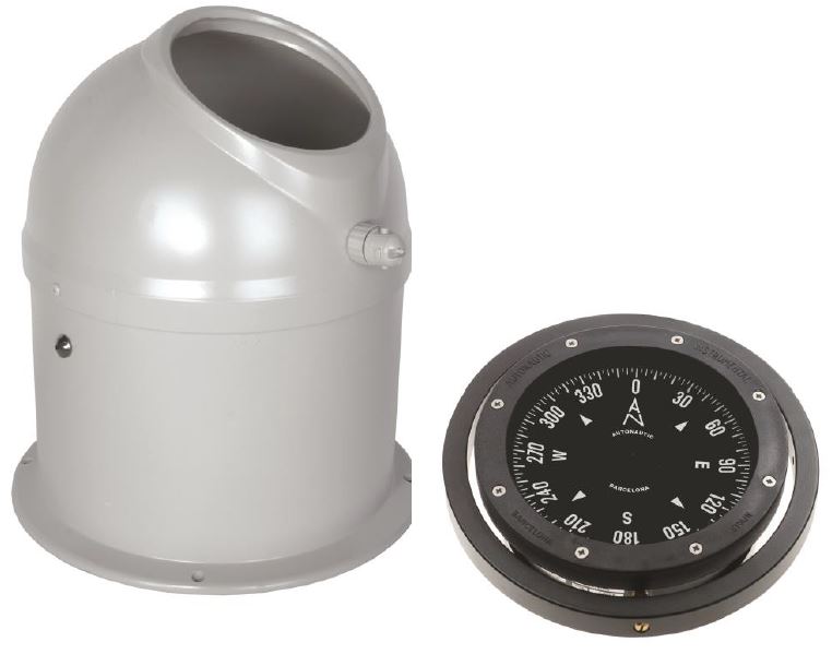 100 mm card with two lubber lines in brass black painted cardanic housing all mounted in binnacle.