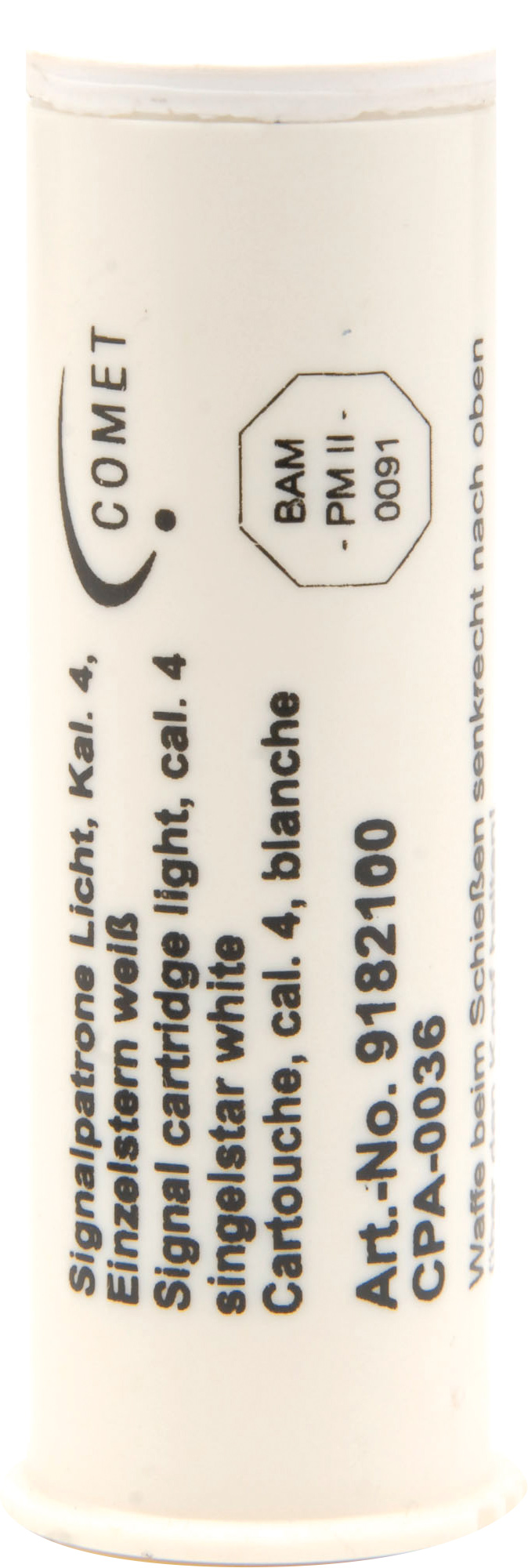 Safety Equipment>Lifesaving>Pyrotechnics Signal cartridge caliber 4 white Productcode: 31221 Comet Cal. 4 cartridge, white Art.-No.: 9182100 Download this page Signal cartridge caliber 4 white Request Quote