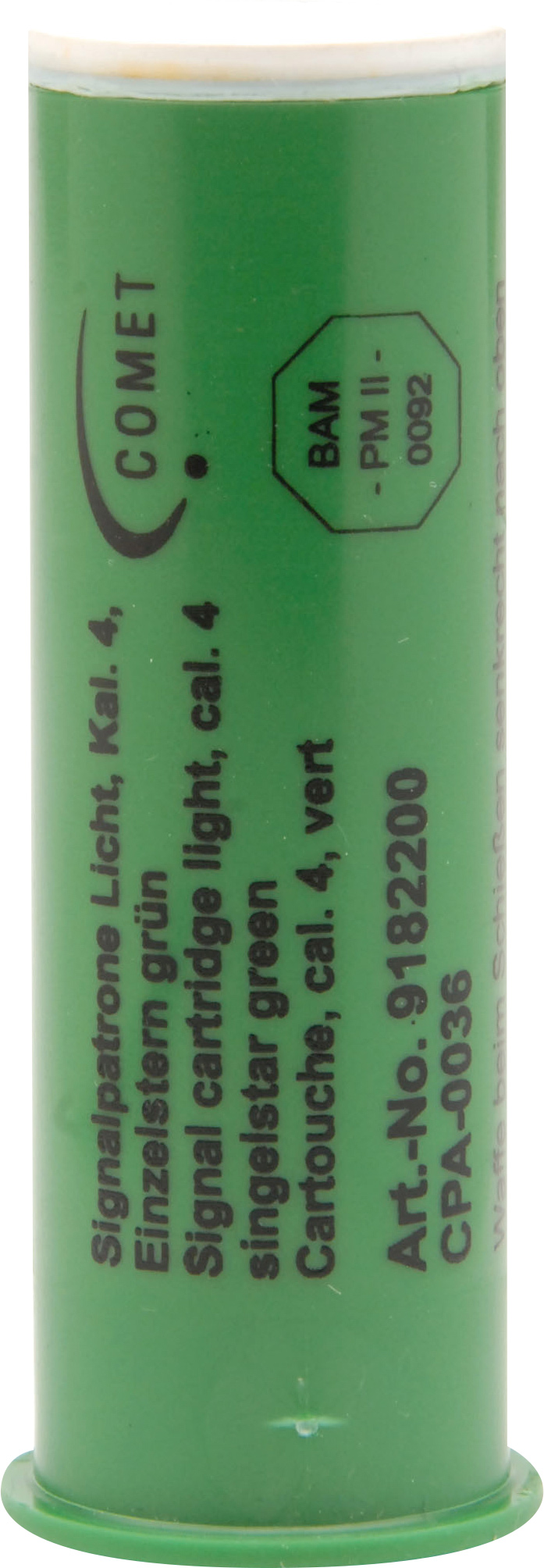 Safety Equipment>Lifesaving>Pyrotechnics Signal cartridge caliber 4 green Productcode: 31222 Comet Cal. 4 cartridge, GREEN Art.-No.: 9182200 Documents Product Datasheet Download this page Signal cartridge caliber 4 green Request Quote