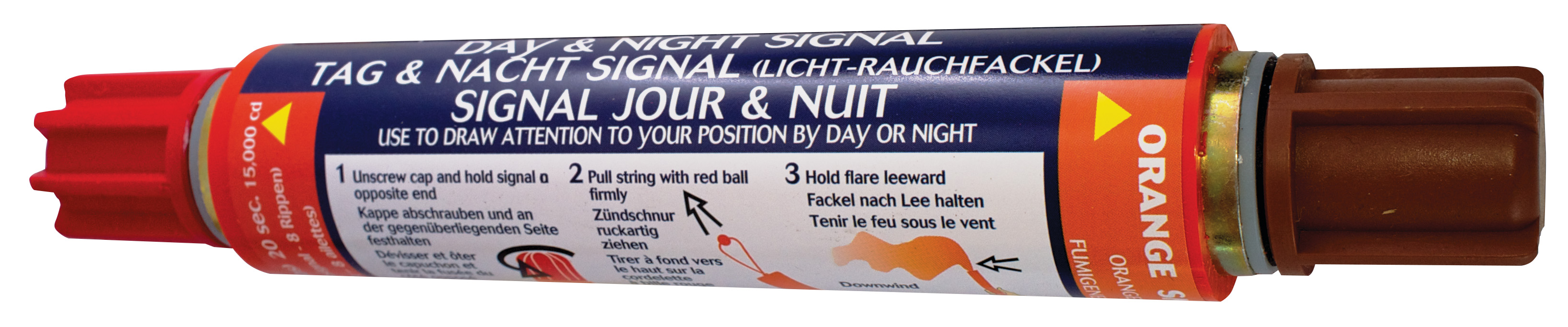 Compact, handheld distress signal consisting of a red flare at one end and an orange smoke in the other.